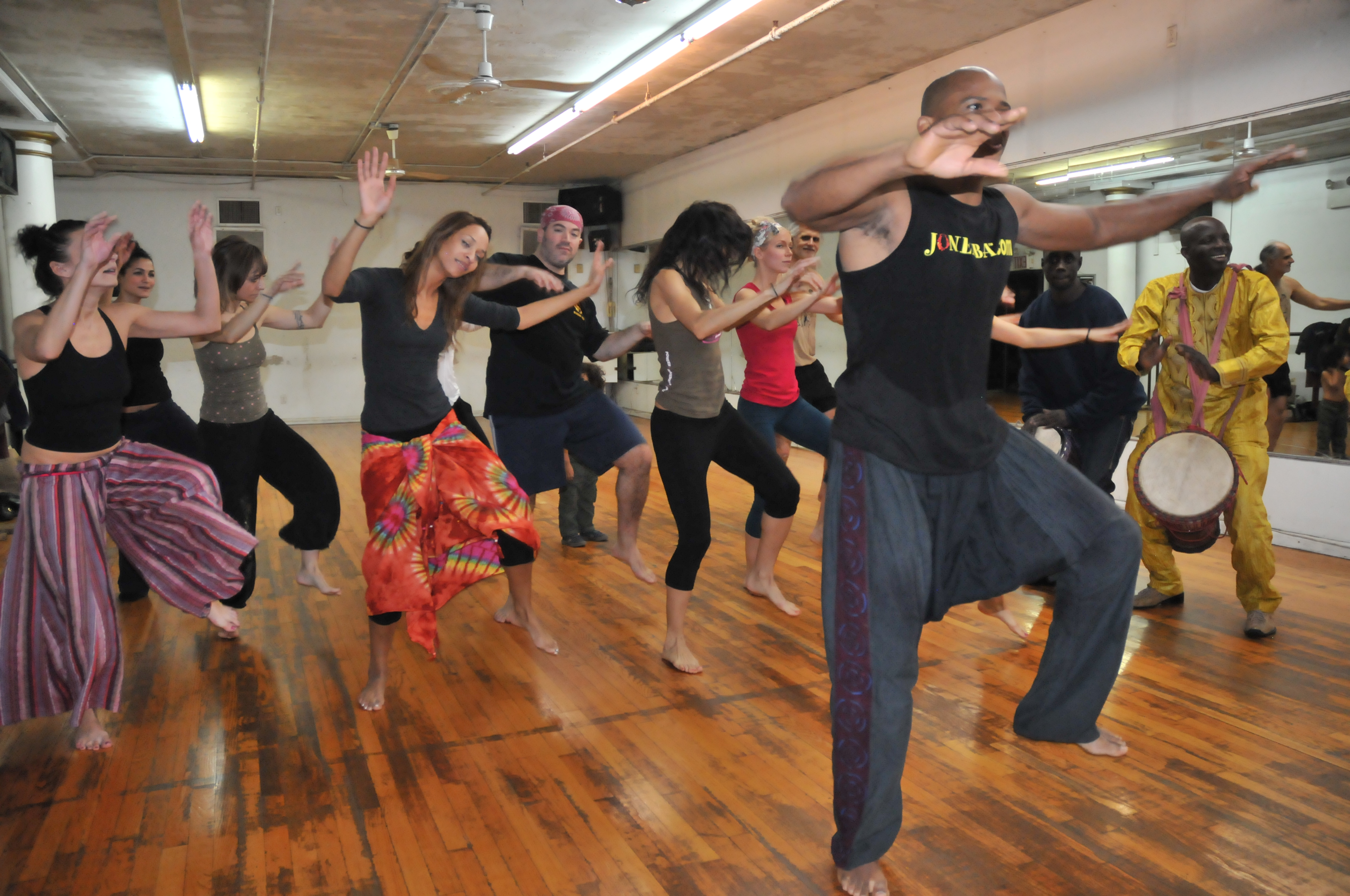 You may notice some students in African print skirts. It’s up to you and your thoughts on cultural misappropriation (I’ll leave that to you). I wear basic workout tights and a black shirt (to mask the copious amounts of sweat). Others may wear sweat pants or shorts and a tee. If you are going to wear a skirt, please be aware that there may be a warm up portion that could require leg lifting. You might want some shorts under them skirts. But whatever you wear, make sure you can freely move!